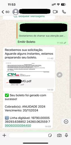 O Conselho Regional de Medicina de Minas Gerais (CRM-MG) alerta sobre tentativas de golpe que utilizam mensagens de WhatsApp para enviar cobranças falsas. Estelionatários têm enviado boletos bancários e links para pagamentos, fingindo representar o CRM-MG ou o Conselho Federal de Medicina (CFM) com cobranças para o pagamento da anuidade.